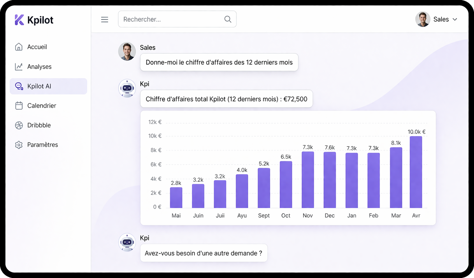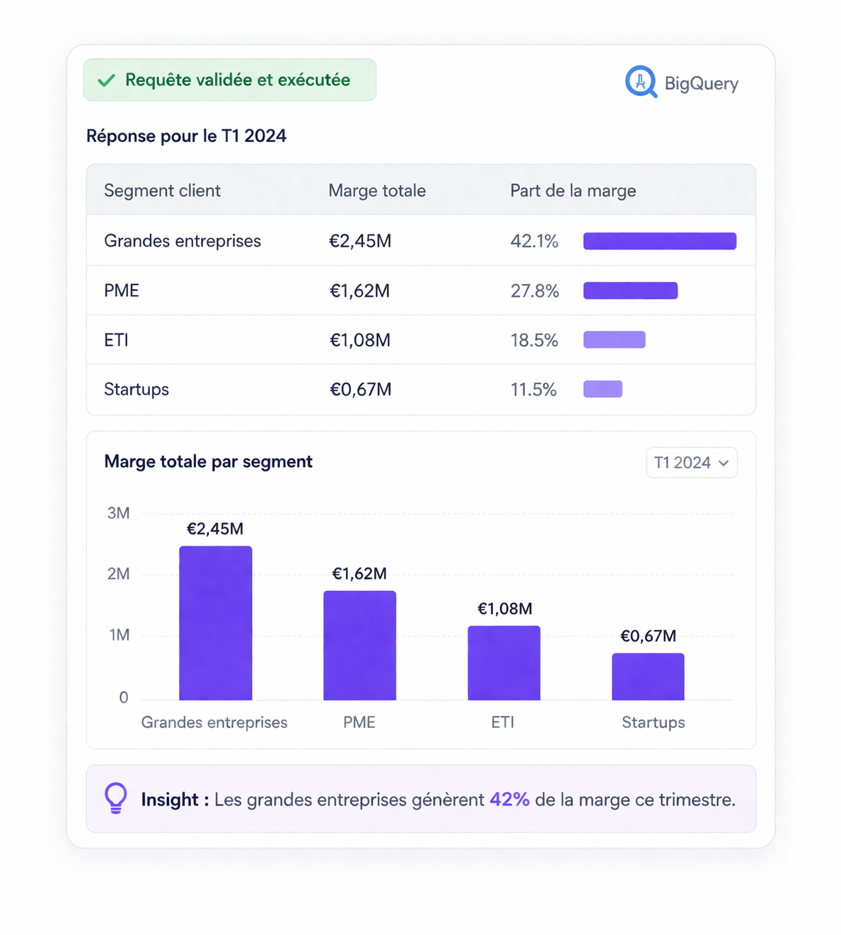 Ask any business question in French. KPIlot generates the SQL query, validates it against your data contract, executes it on BigQuery, and returns a structured, reliable answer.